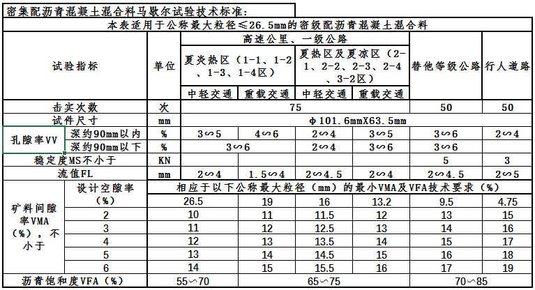 交通部发布的规范采用马歇尔试验混合料配合比设计方法,沥青混合料技术要求应符合以下规定: